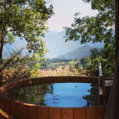 This is a residential retreat amongst acres of wild nature with access to a fresh mountain river, hot tubs, swimming pool and sauna!